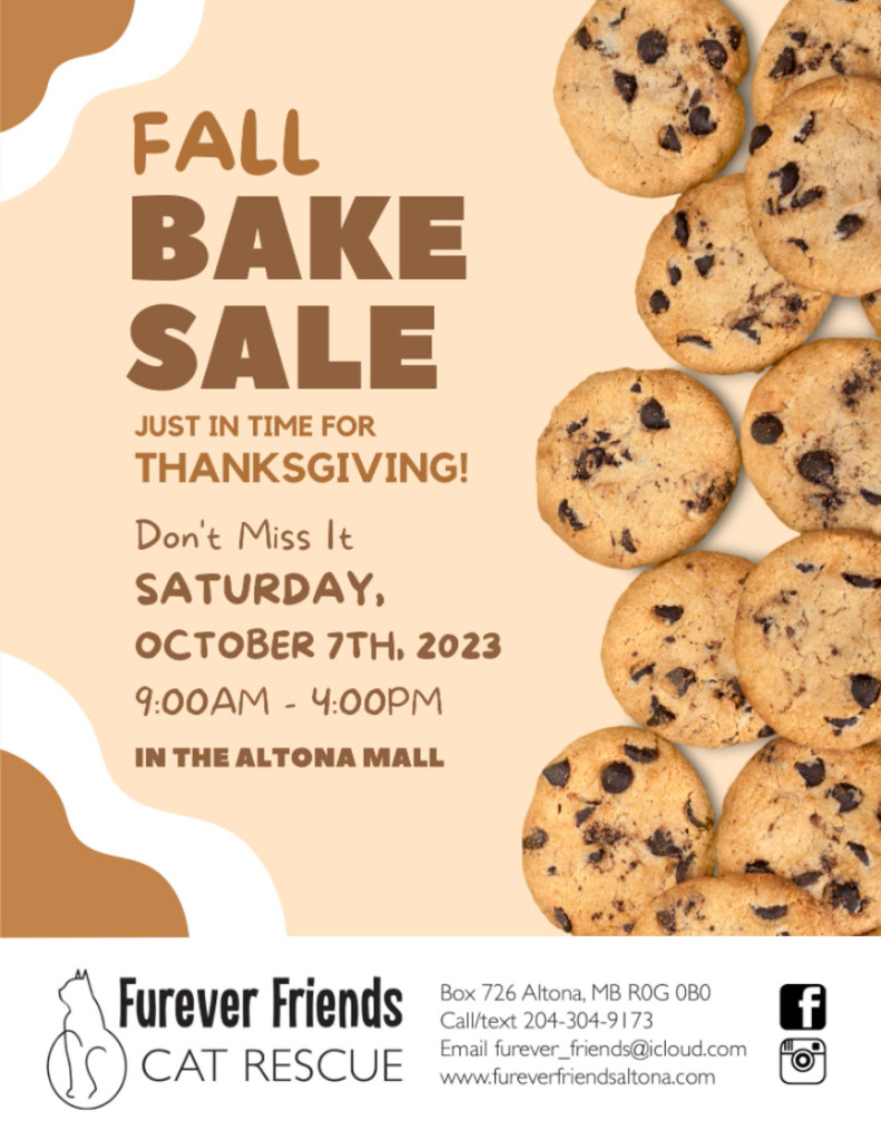Furever Friends Cat Rescue is having a Fall Bake Sale on Saturday, October 7th from 9am-4pm in the Altona Mall, across from IGA. Come on by to stock up on homemade goodies - soup, canning, sweets and more! Just in time for Thanksgiving! All proceeds go directly to vet care for the animals in our rescue.