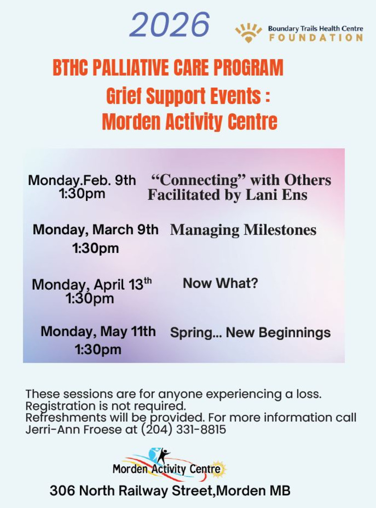 The BTHC Palliative Care Program Grief Sessions is returning this fall to the Morden Activity Centre.