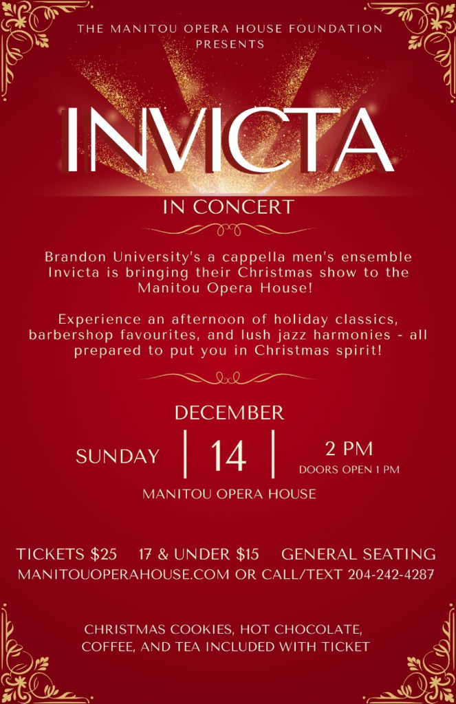 Brandon University’s a cappella men’s ensemble Invicta is bringing their Christmas show to the Manitou Opera House!
