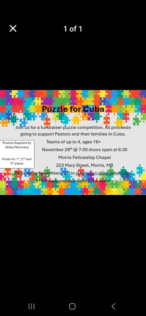 Join us for a fundraiser Puzzle Competition. All proceeds going to support Pastors and their families in Cuba. Teams of up to 4. November 29th at 7. Doors open at 6:30.$100/team payable before the event. Prizes!