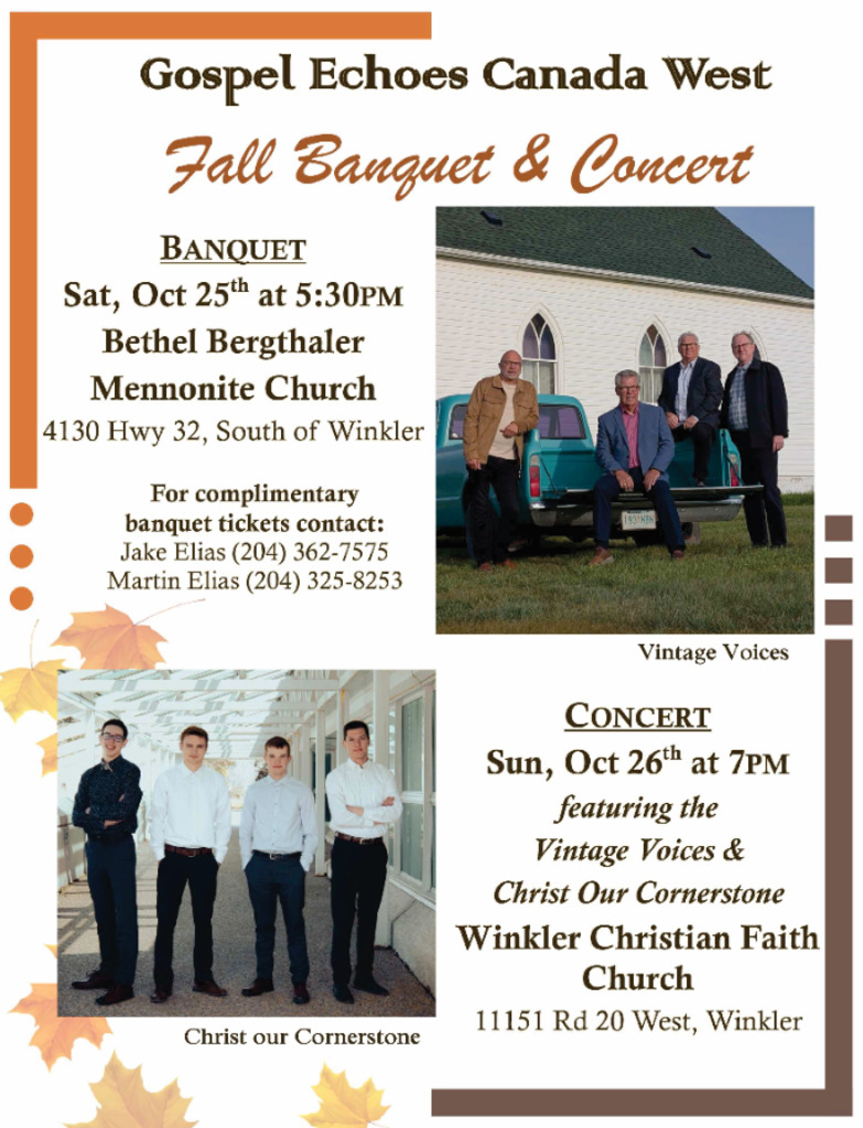 Thousand Oaks Ministries will be hosting the Annual Gospel Echoes Prison Ministry Music Night on October 26th at the Christian Faith Church in Winkler. This will be an informative evening with reports from behind the bars and with music and singing by the Gospel Echoes Canada West Music Team, The Vintage Voices as well as a local group of young men, Christ the Cornerstone. NO TICKETS are needed...... Admission is free with a freewill offering to be taken for Prison Ministry. Plan to join us for this inspirational evening.