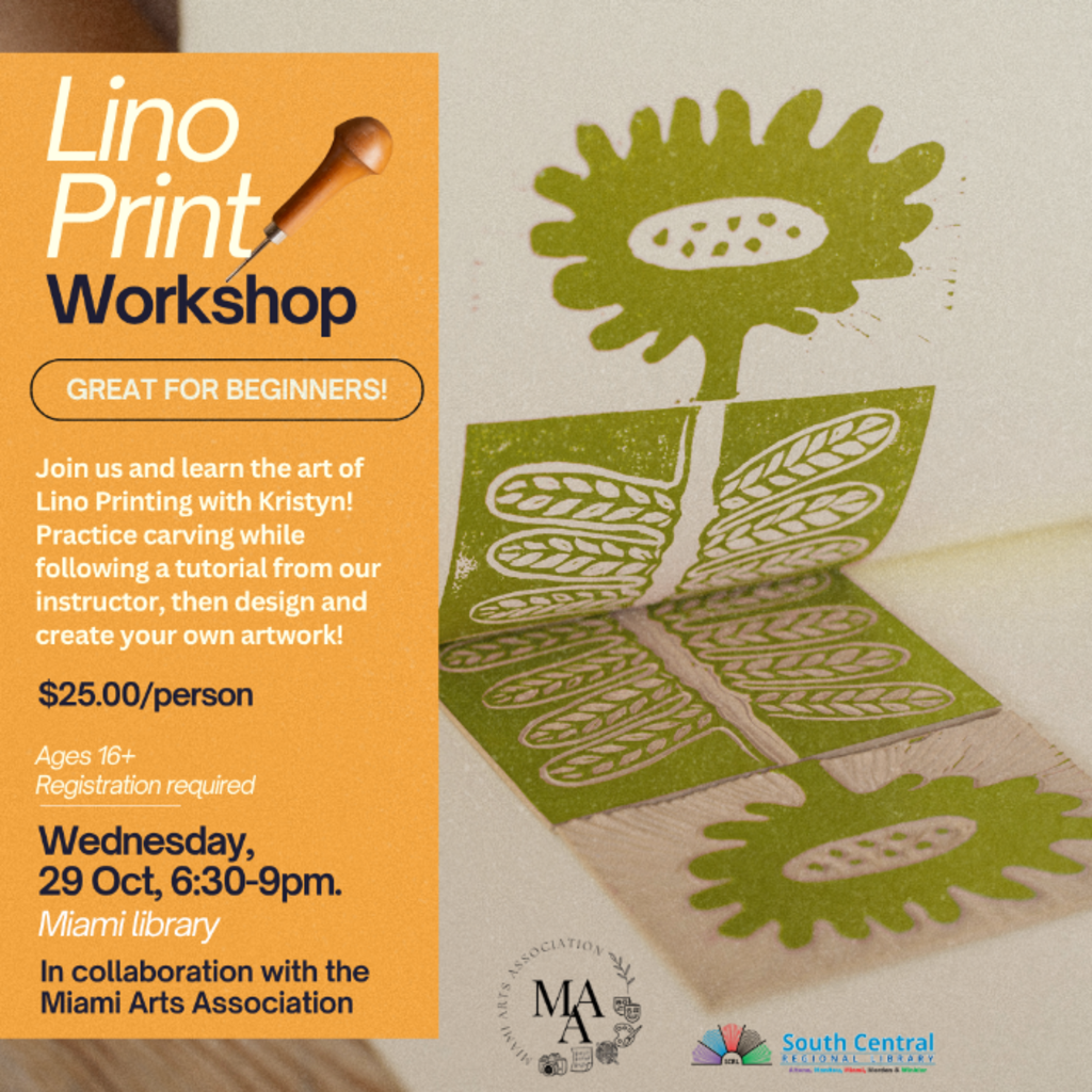 Join the Miami Library and Miami Arts Association and learn the art of Lino Printing with Kristyn! Practice carving while following a tutorial from our instructor, then design and create your own artwork!