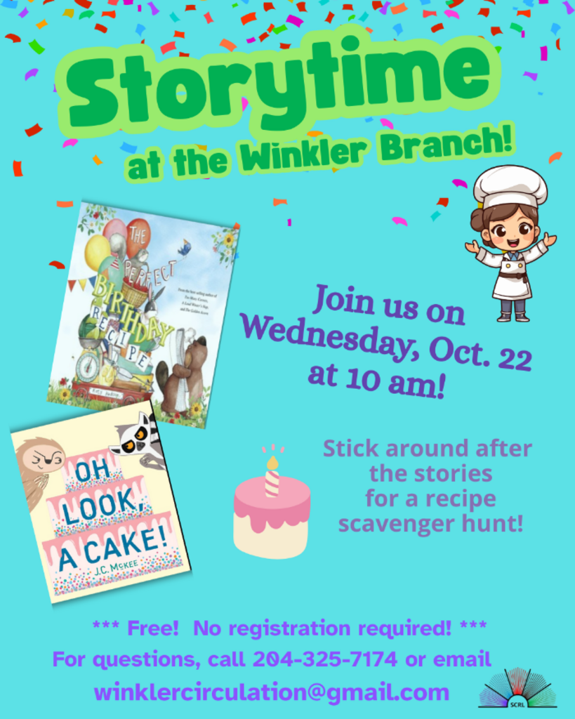 Storytime at the Winkler Library is happening on October 22nd at 10:00AM! Today’s theme is Cake and we will be reading “The Perfect Birthday Cake recipe” and “Oh Look, it's Cake!”. Be sure to stick around after our stories, we’re doing a fun recipe scavenger hunt! No registration required, just drop in!