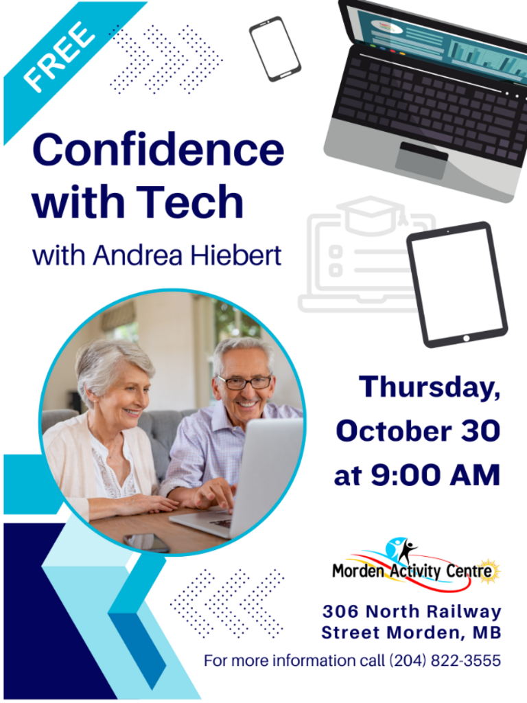 Do you find yourself wishing you could use your phones/iPads/tablets/computers more confidently? We are excited to offer you Confidence with Tech session with Andrea Hiebert at the Centre!
