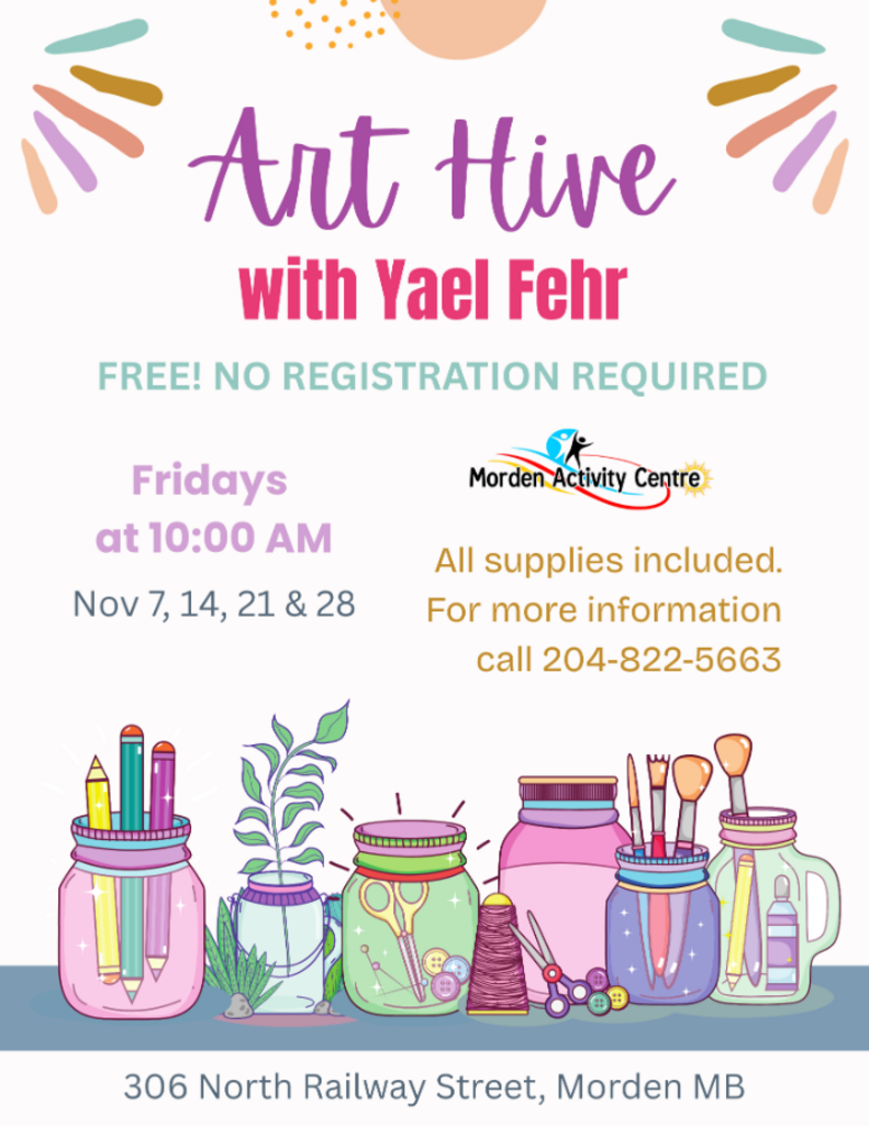 An Art Hive is a community art studio that welcomes all to learn, explore and share in the creation of art, regardless of skill or ability. This activity allows for dialogue and engagement with others in the community.