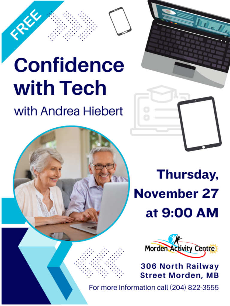 Do you find yourself wishing you could use your phones/iPads/tablets/computers more confidently? We are excited to offer you Confidence with Tech session with Andrea Hiebert at the Centre!