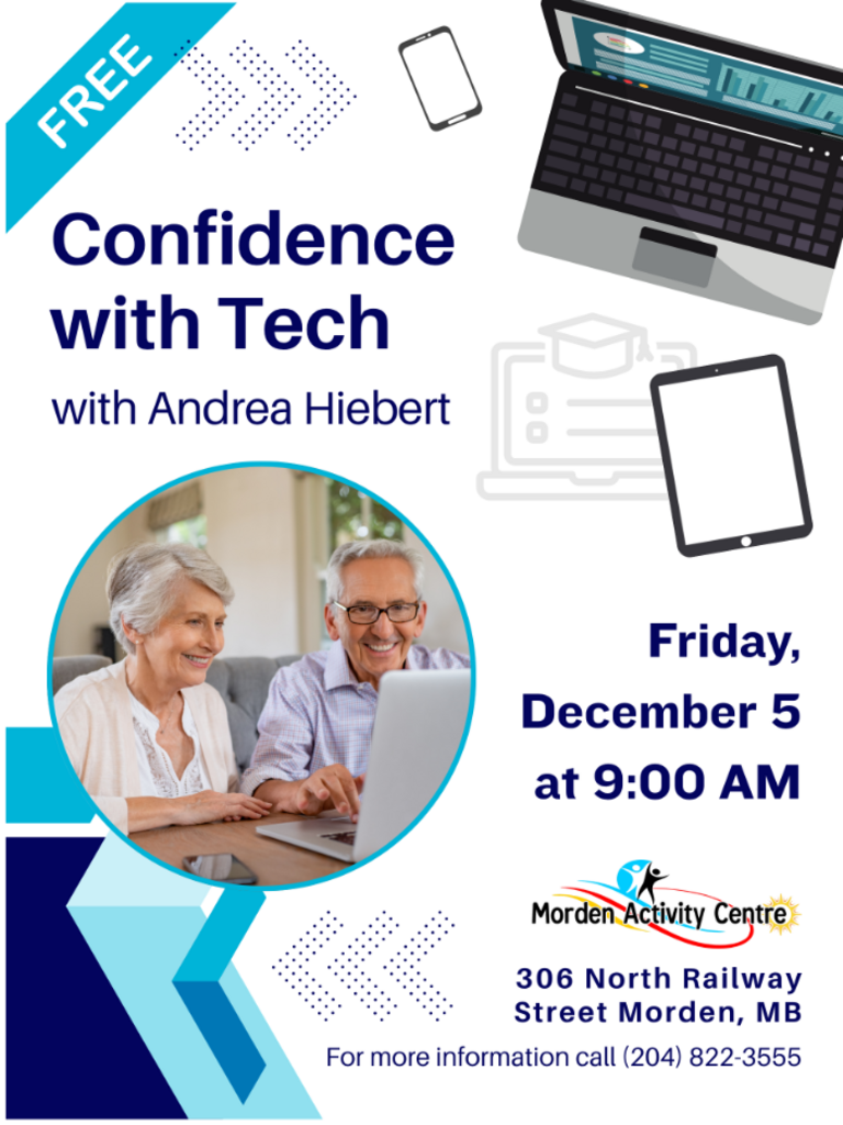 Do you find yourself wishing you could use your phones/iPads/tablets/computers more confidently? We are excited to offer you Confidence with Tech session with Andrea Hiebert at the Centre!
