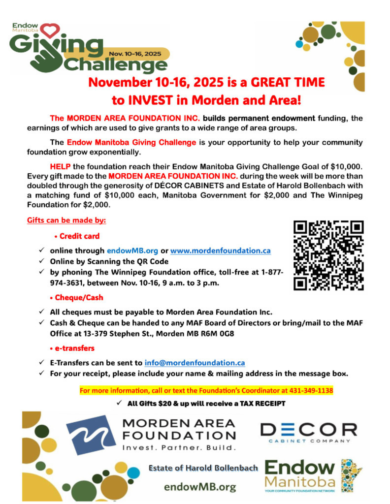 Every gift made to the MORDEN AREA FOUNDATION INC. ( up to $10,000) during the week will be more than doubled