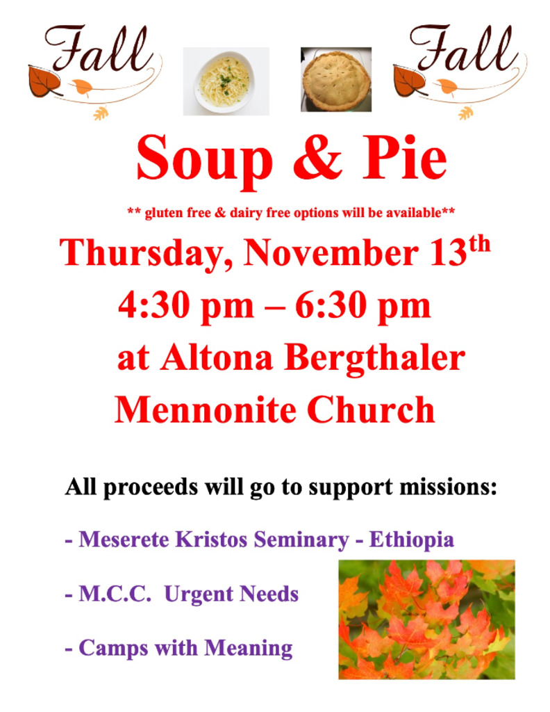 Fall Soup & Pie Fundraiser for World Missions at Altona Bergthaler Mennonite Church.
