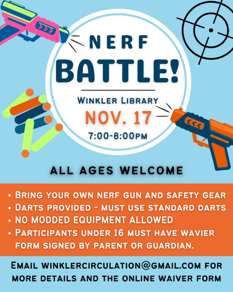 Come to our Nerf Battle on November 17th at the Winkler Library! All ages are welcome, however if you’re under 16 your parent/guardian will need to sign a waiver. Come for 6:30PM if you need to do that, otherwise, the battle starts at 7PM. Remember, you’ll need to bring your own nerf gun and safety equipment (no modified equipment), but most importantly.. have fun!
