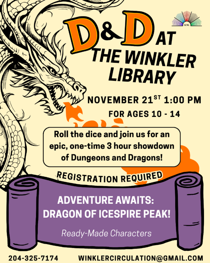 Sharpen your swords and polish your wands! On November 21st at 1 PM, prepare to embark on a 3-hour whirlwind adventure in the world of Dungeons and Dragons. Young heroes aged 10-14 will brave the icy challenges of the Dragon of Icespire Peak with characters ready for action. But hold your horses (or dragons)! To secure your place in this epic quest, you must register by calling 204-325-7174 or sending an email to winklercirculation@gmail.com. Magic and mayhem await!