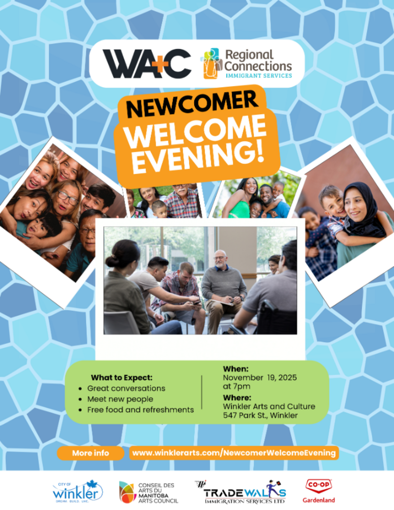 Our Newcomer Welcome Evening is happening on November 19th at 7:00 pm here at Winkler Arts + Culture.