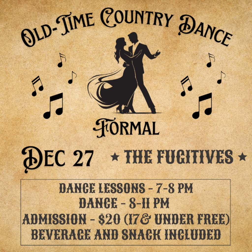 Put on your dancing shoes and join us for a lively old-time dance with the toe-tapping tunes of The Fugitives, with optional formal wear for the last dance of the year! The evening kicks off with dance lessons at 7 PM, perfect for getting into the groove, followed by the main event at 8 PM. Admission includes a complimentary beverage and snack, so come ready to dance the night away! All ages and skill levels welcome!