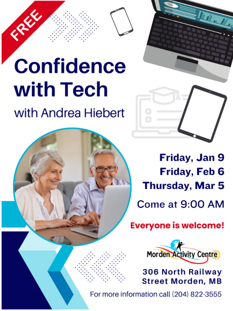 Do you find yourself wishing you could use your phones/iPads/tablets/computers more confidently? We are excited to offer you Confidence with Tech sessions with Andrea Hiebert at the Centre!