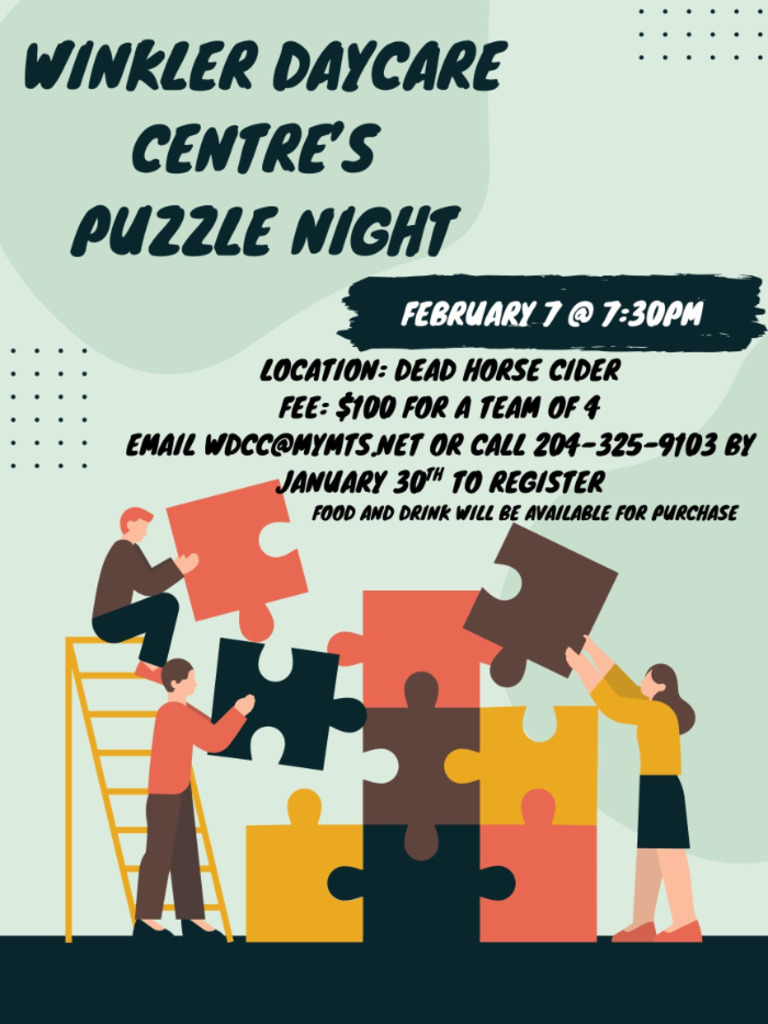 A fun puzzle competition at Dead Horse Cider on February 7 @ 7:30 pm! Email WDCC@mymts.net or call 204-325-9103 to register a team. Cost is $100 for a team of 4.