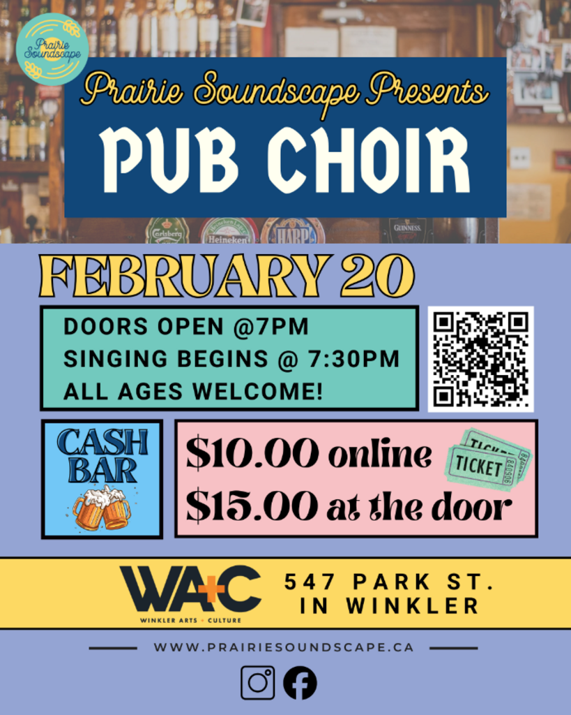 Join us on February 20th for Pub Choir! Pub Choir in a nutshell is an event where we get together to learn a song, while enjoying some snacks and beverages, as well as each other's company!