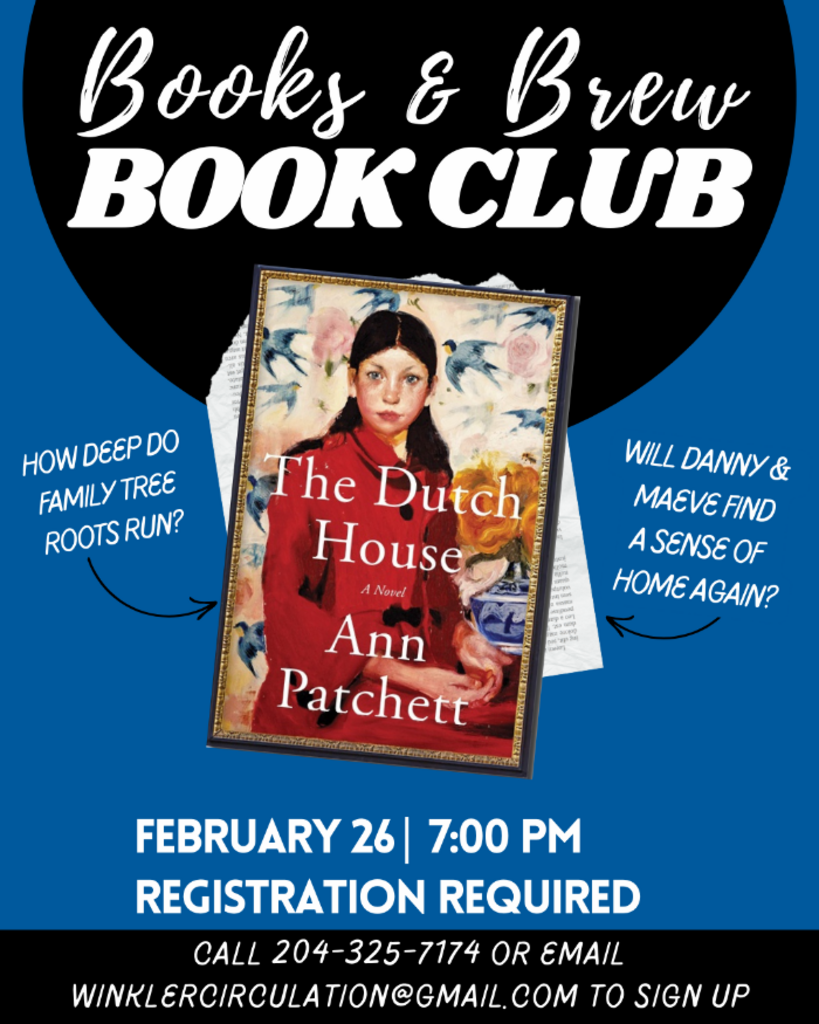 Books & Brew meets every last Thursday of the month at 7:00pm. Registration is required, feel free to visit us in person, call us at 204-325-7174 or email us at winklercirculation@gmail.com to sign up!
