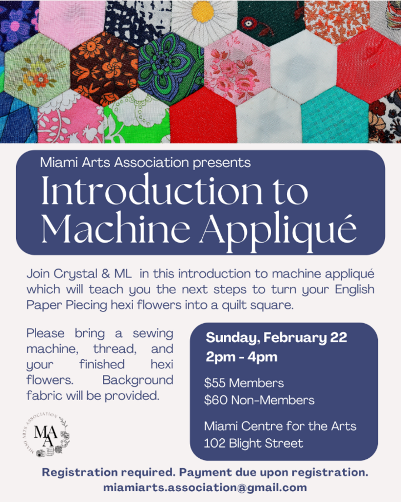 Please bring a sewing machine, thread, and your finished hexi flowers. Background fabric will be provided.