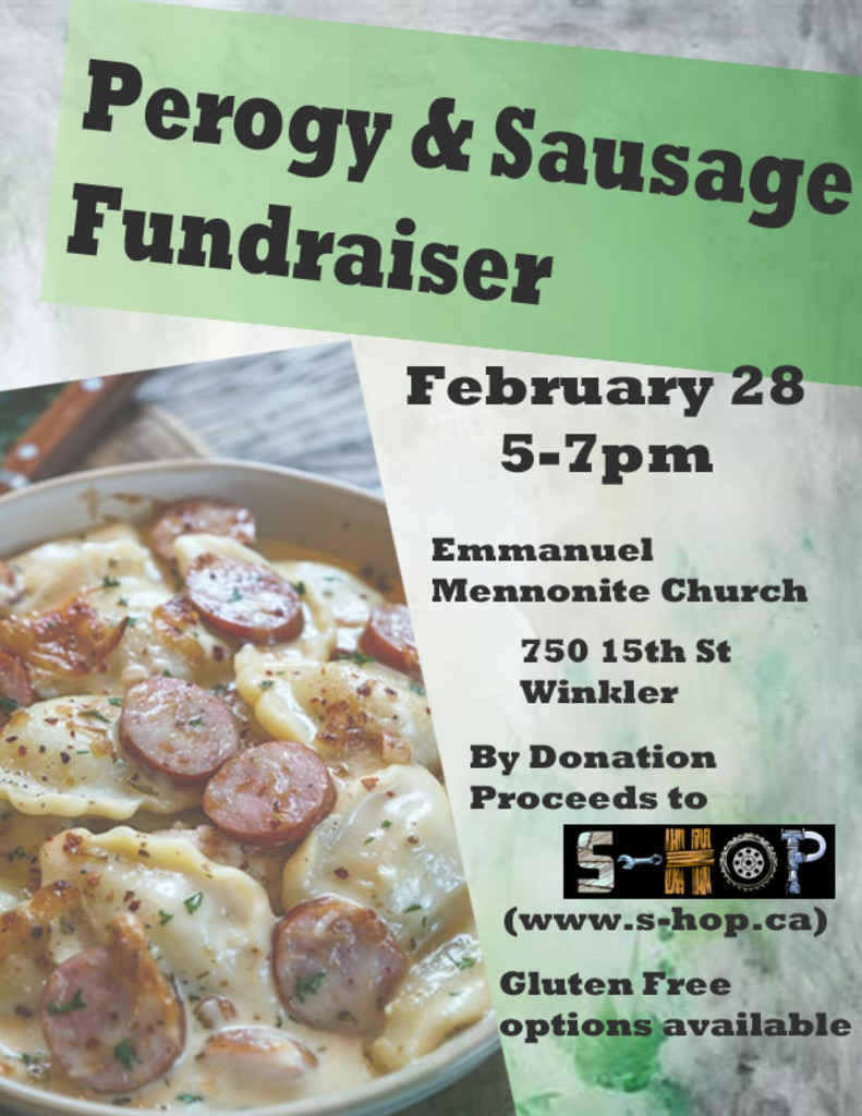 Perogy and sausage supper fundraiser. By donation. Proceeds to S-HOP. Take out and gluten-free options available.