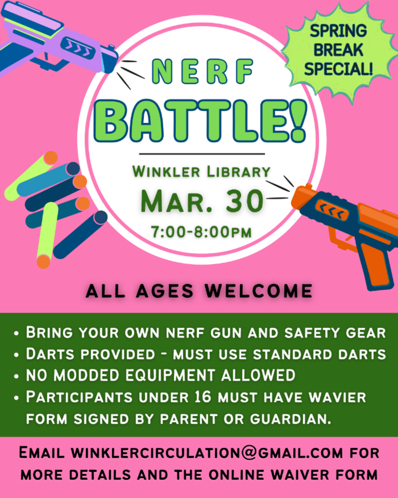 Everyone's invited, but if you're under 16, make sure your trusty parent or guardian signs a waiver. Pack your own Nerf blaster and safety gear—don't worry, we've got the darts (just stick to the standard ones if you are bringing some please). Leave your modded gear at home for this showdown. For more details and to snag the online waiver, shoot an email to winklercirculation@gmail.com. Let the foam darts fly!