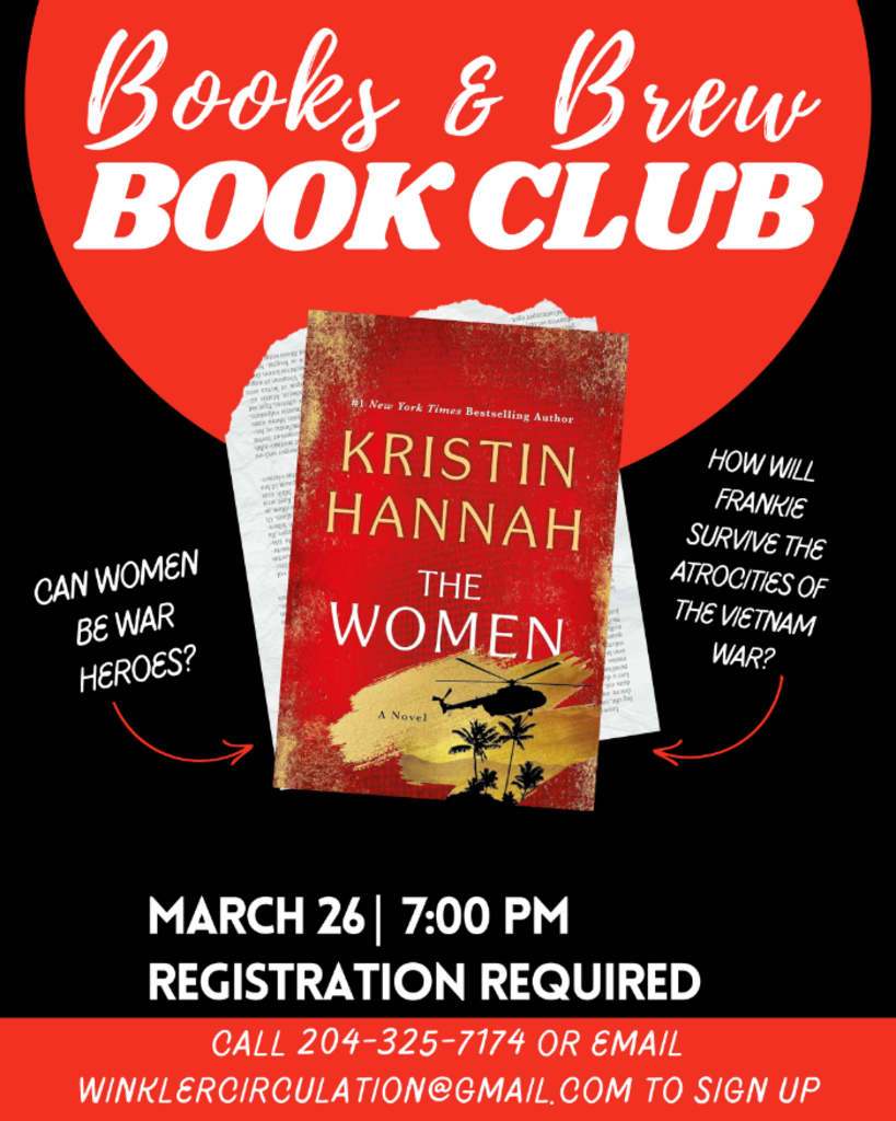 Books & Brew meets every last Thursday of the month at 7:00pm. Registration is required, feel free to visit us in person, call us at 204-325-7174 or email us at winklercirculation@gmail.com to sign up!